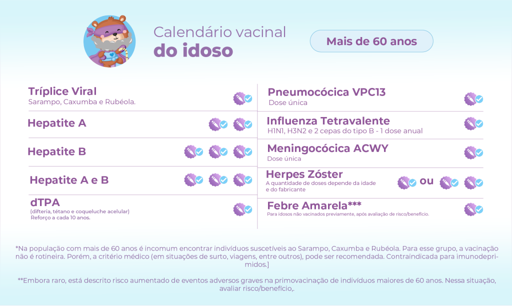 Com o calendário vacinal do idoso, você garante proteção contra doenças como a pneumonia, herpes zóster e influenza. Vacinas atualizadas ajudam a fortalecer sua imunidade e a manter uma vida ativa e saudável. Previna-se e viva com mais qualidade! 💉👴👵